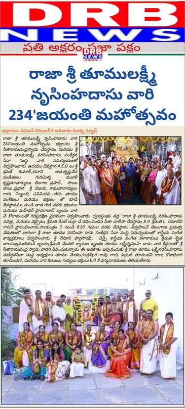 To preserve the kirtans and bhajan tradition of Raja Sri Tumu Narsimha Das, the revered savior of the Bhadrachalam region, the Tumu descendants founded this trust on 29th December 2022. The trust aims to promote the services and contributions made to the Sri Sita Ramachandra Swamy Temple after Ramdas, as well as to carry out social service globally.
